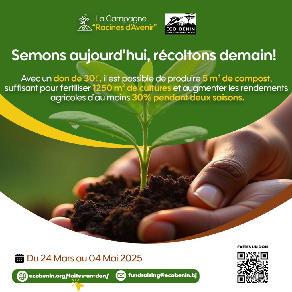 Agissez avec nous pour soutenir la transition écologique au Bénin. En 2024, une stratégie d’économie circulaire a été développée dans le Mono pour valoriser les biomasses et déchets ménagers. En 2025, l’objectif est de mettre en œuvre cette stratégie, sensibiliser les acteurs publics, scolaires et agricoles, et faciliter l’accès au marché des produits issus de cette économie. Avec 30 €, vous aidez un agriculteur à produire du compost naturel, favorisez une agriculture durable et protégez la biodiversité. Les dons sont déductibles via la Fondation Roi Baudouin. Merci pour votre soutien !